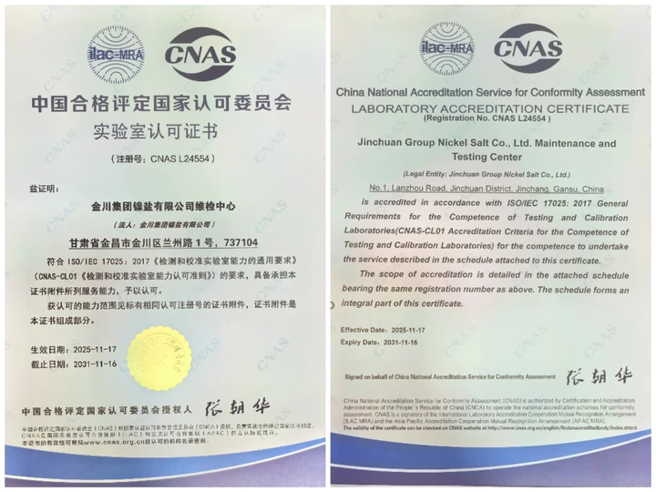 近日,金川集团镍盐公司维检中心成功通过中国合格评定国家认可委员会评审,获颁实验室认可证书(注册号:CNAS L24554)。标志着镍盐公司维检中心管理体系与检测能力全面接轨国际标准,为质量管控升级及产业链高质量发展筑牢技术根基。