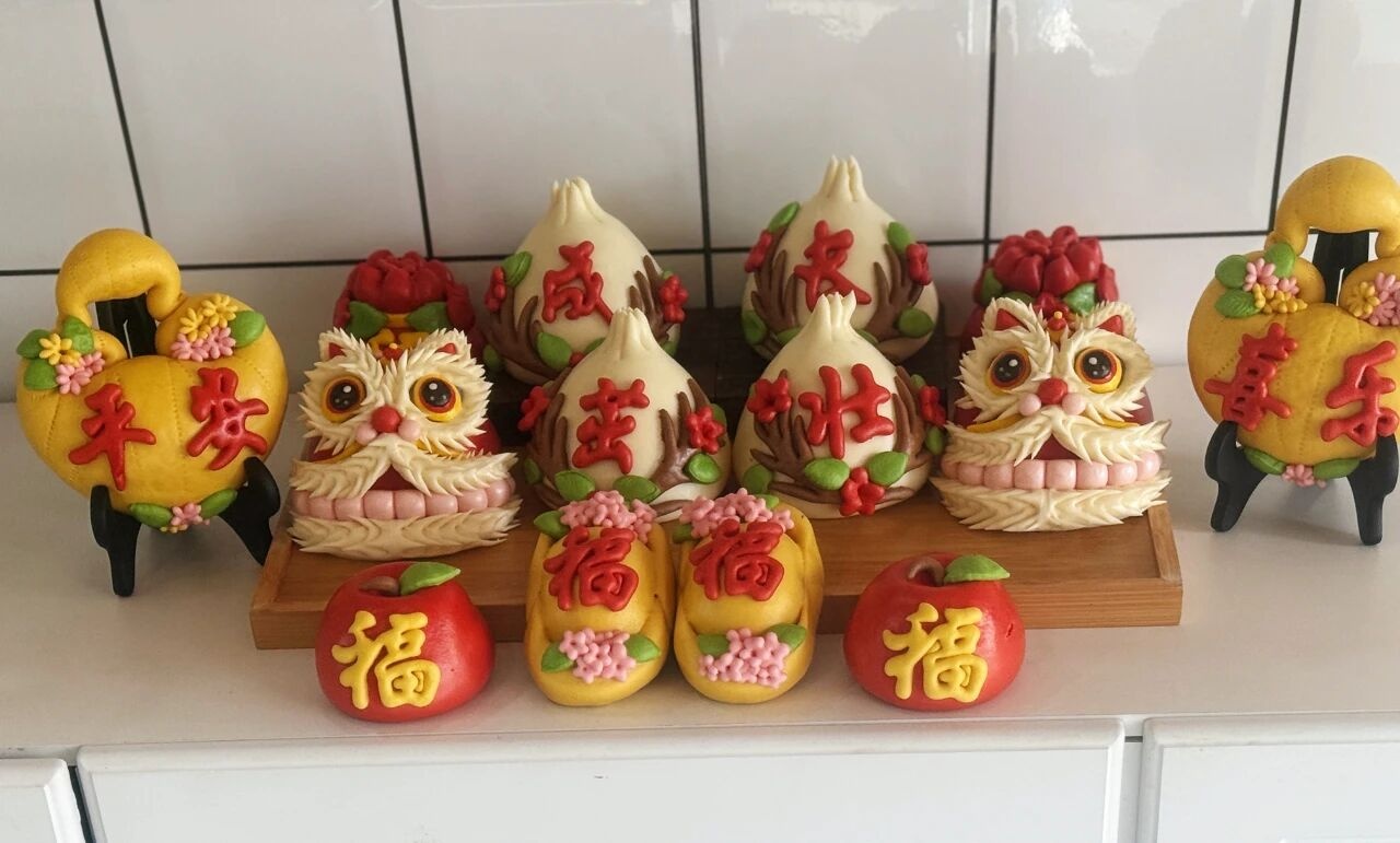 制作间里的苏娜,眼神专注,一丝不苟。她拿出蒸熟的南瓜混着鸡蛋、面粉揉出黄色面团,菠菜汁、红曲米粉、可可粉分别调出绿、红、棕等色彩,揉、搓、捏、拽、剪……普通面团便披上“彩衣”,变身寿桃、醒狮、生肖等造型。