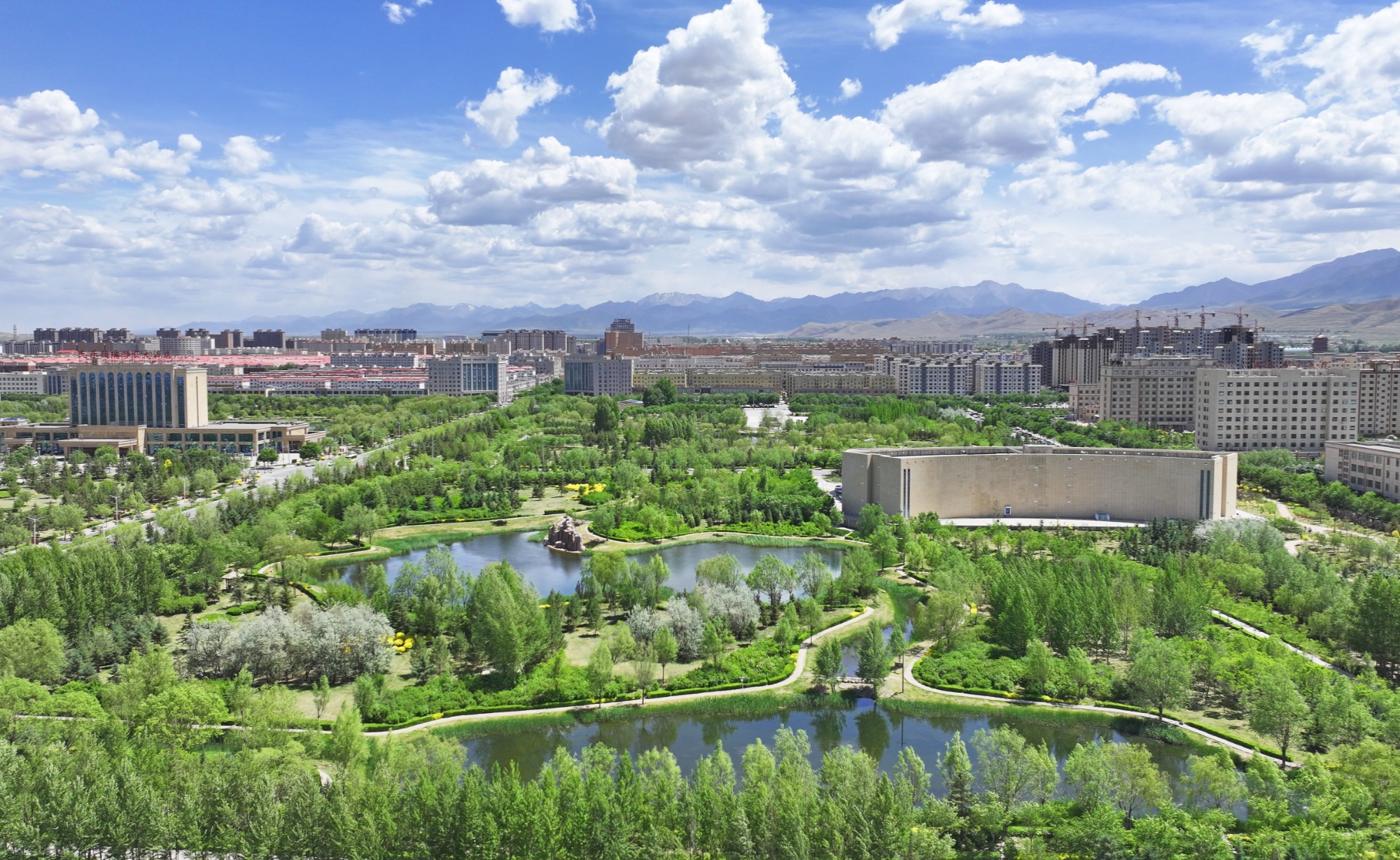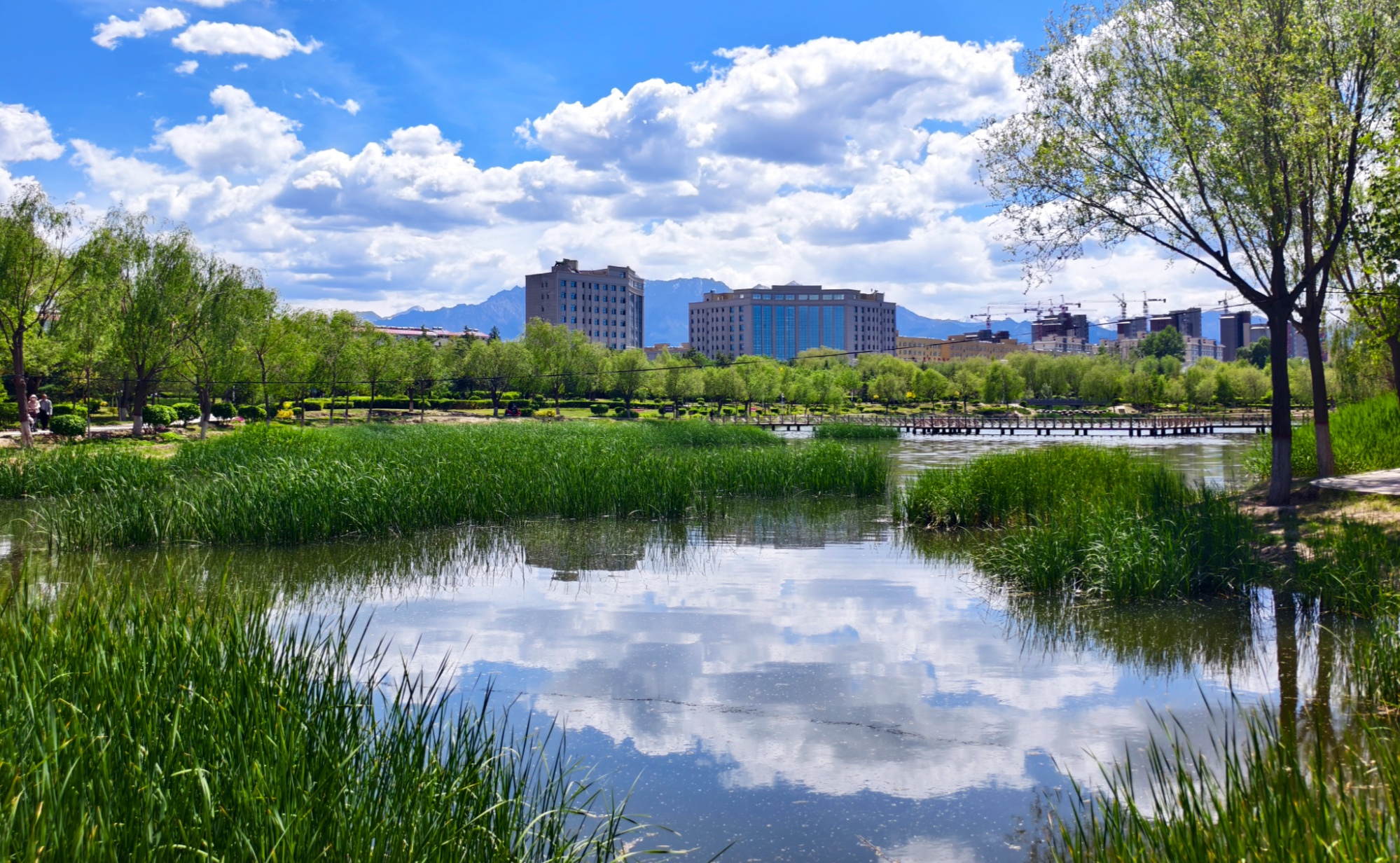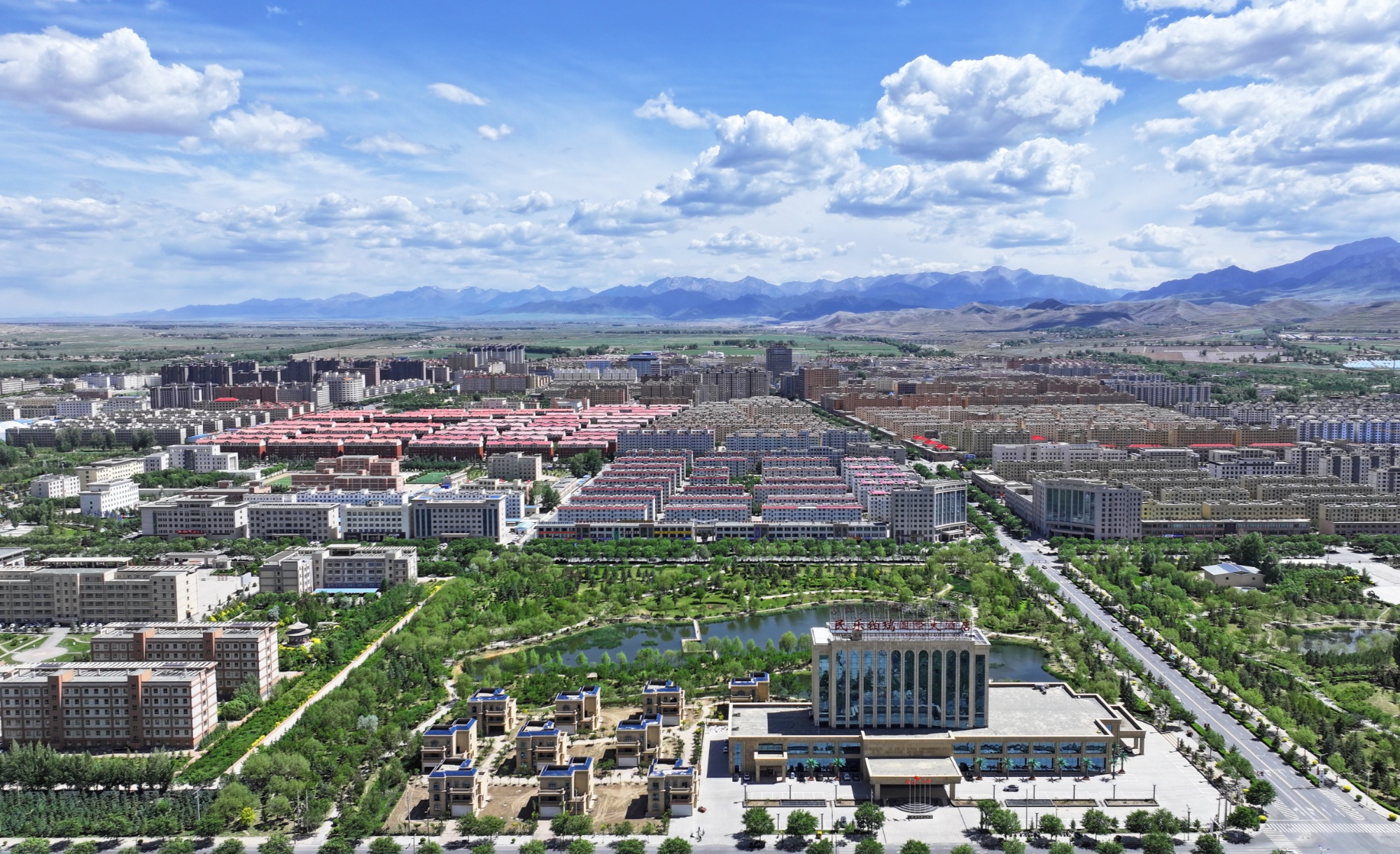 近日,雨过天晴的甘肃省张掖市民乐县,山峦与公园、民居相映成趣,在蓝天和白云的映衬下,绘出一幅如诗如画的生态画卷。