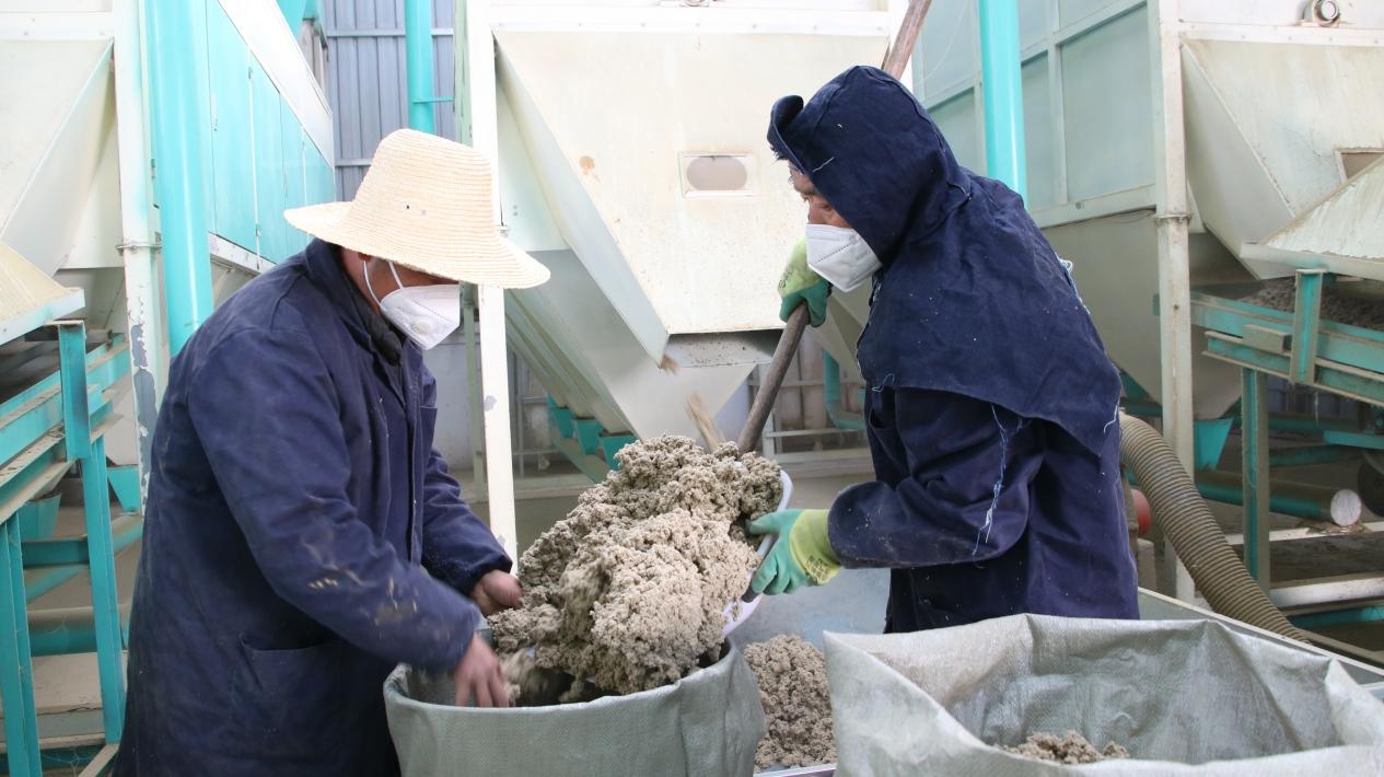 工人将加工好的艾绒装袋(宋海涛 摄)